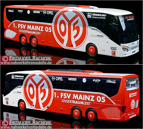 Mannschaftsbus Setra S 516 HD BOHR Omnibus GmbH Eigenumbau Auflage: 1 Stück Basismodell von AWM Automodelle GmbH Gebaut: 07/2019 Maßstab 1:87 (H0) Ziel: --- Werbung: "1. FSV Mainz 05" Kennzeichen: "MZ - MZ 1555" Vorbild: Setra S 517 HD Airbrushlackierung, Beschriftung mittels selbst erstellten Nassschiebern XXL-Foto >> |