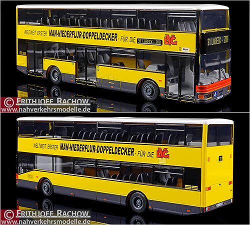 Doppelstockbus MAN SD 200 Lübeck Travemünder Verkehrsgesellschaft mbH Hersteller: Wiking Maßstab 1:87 (H0) Ziel: "A Lübeck" |