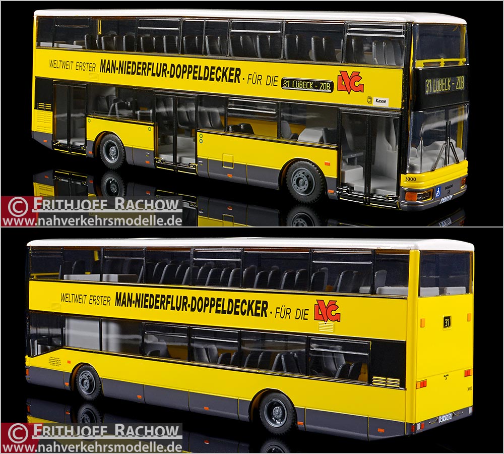Doppelstockbus MAN/ABB Henschel DN 95 Lübeck Travemünder Verkehrsgesellschaft mbH - LVG Berliner Verkehrsbetriebe - BVG Sondermodell Auflage: 141 Stück Hersteller: Rietze #67509-2 Maßstab 1:87 (H0) Auslieferung: 08/2008 Ziel: "31 LÜBECK - ZOB" Wagen-Nr. 3000 Variante mit gelber Front 1996 war dieses Fahrzeug längere Zeit als Leihwagen bei der LVG im Einsatz. XXL-Foto >> |