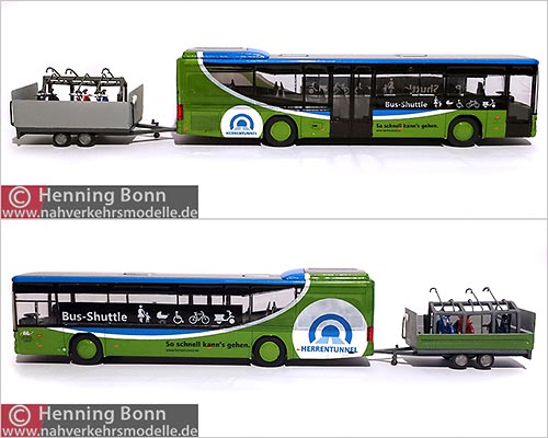 Bus Gastmodell Henning Bonn Setra S 315 NF Lübeck Travemünder Verkehrsgesellschaft mbH - LVG Grundmodell: Rietze GmbH & Co. KG Gebaut: 12/2015 Maßstab 1:87 (H0) Ziel: --- Werbung: "Herrentunnel Bus-Shuttle" Kennzeichen: "HL - LV 112" Wagen 112 Anhänger: Kennzeichen: "HL - LV 333" Wagen 333 - Eigenumbau - XXL-Foto >> |